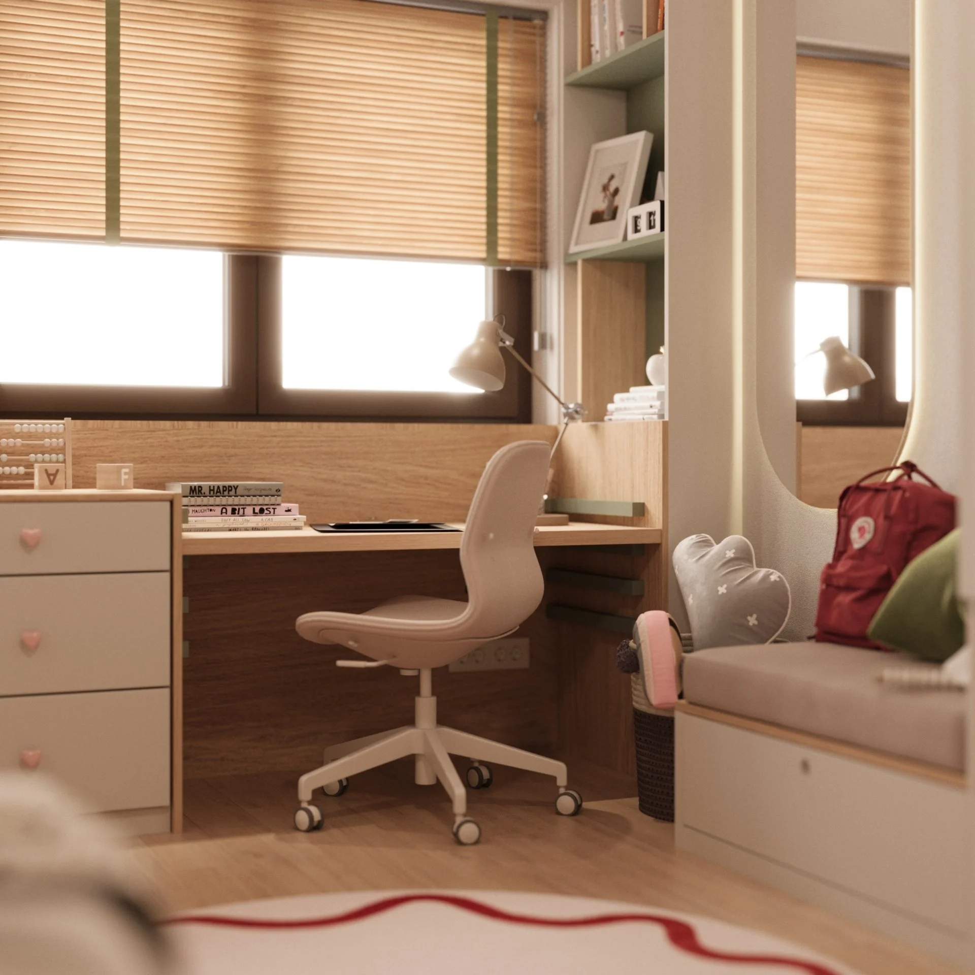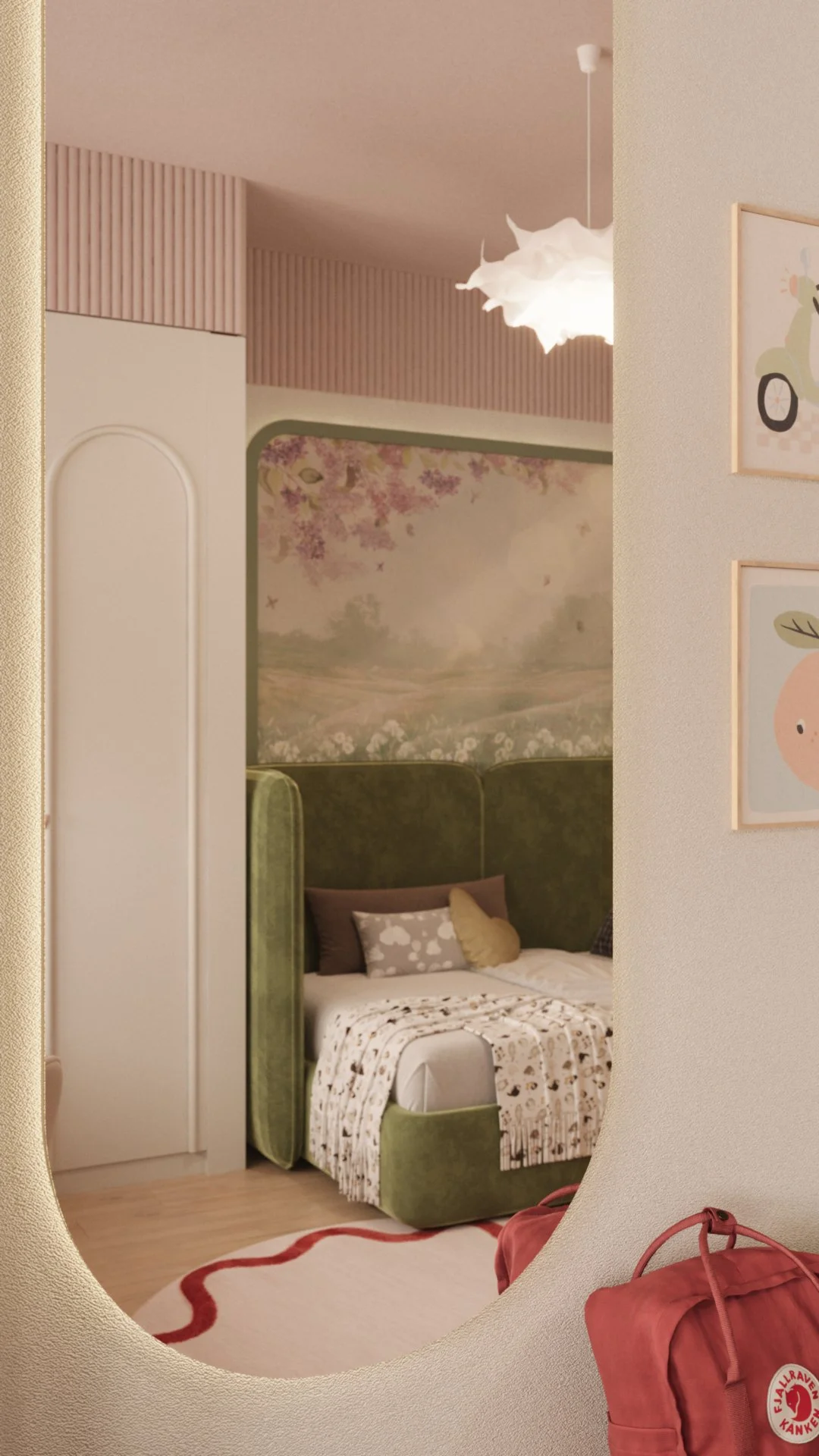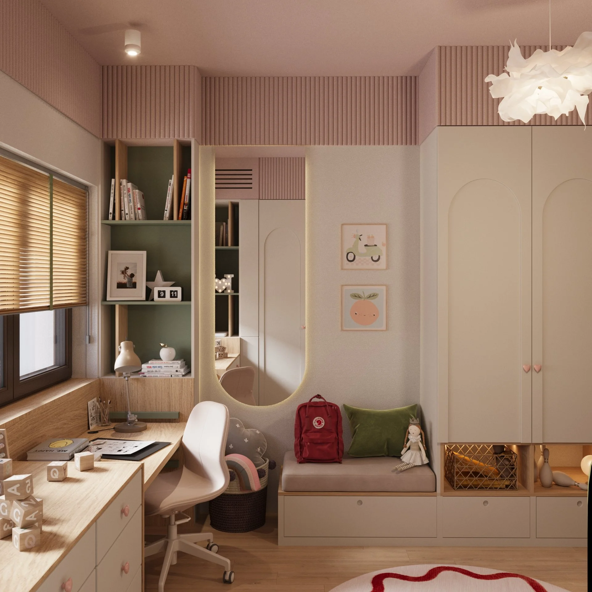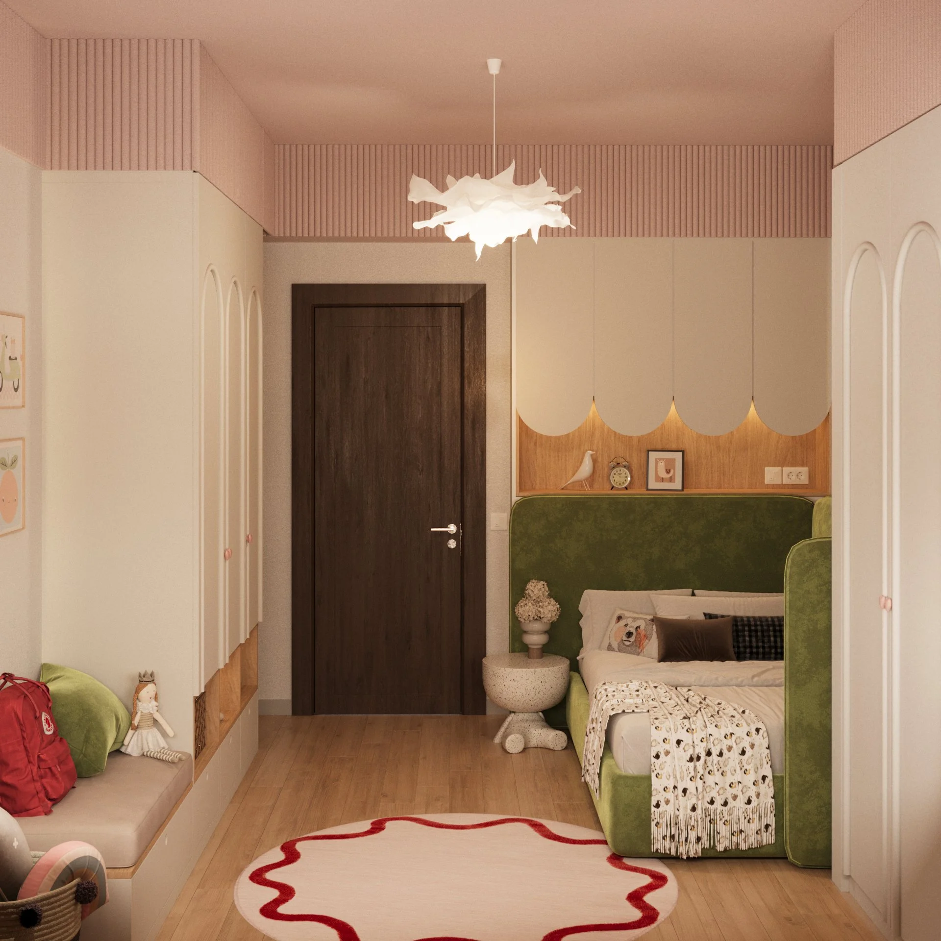 Acest dormitor a fost gândit ca un spațiu cald, echilibrat și adaptat ritmului unei fetițe de 6 ani. Zona de noapte este marcată de un pat tapițat cu forme simple, completată de o cromatică liniștitoare și caldă, unde verdele olive catifelat se întâlnește cu nuanțe pudrate de roz și accente naturale din lemn.
