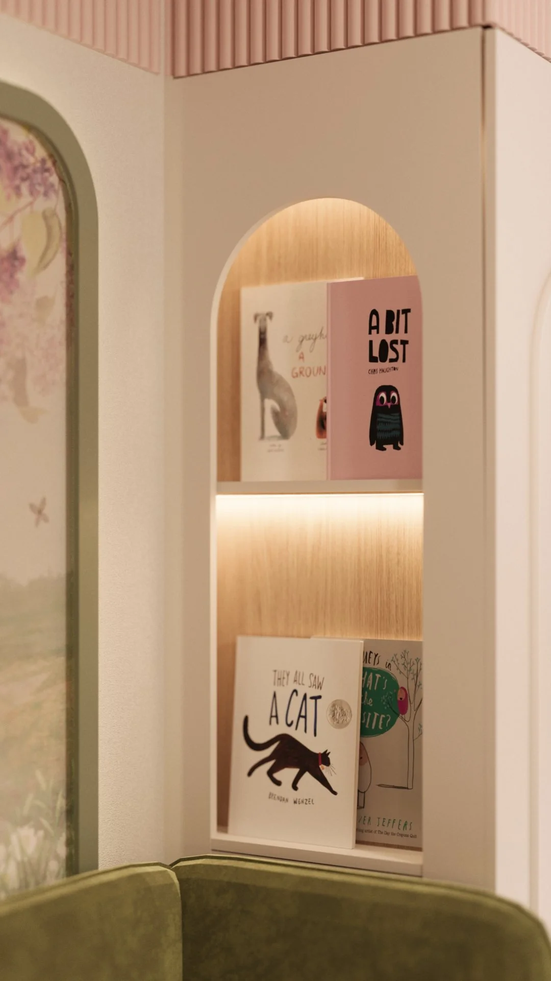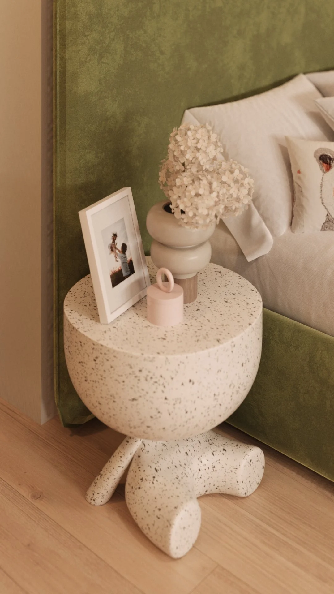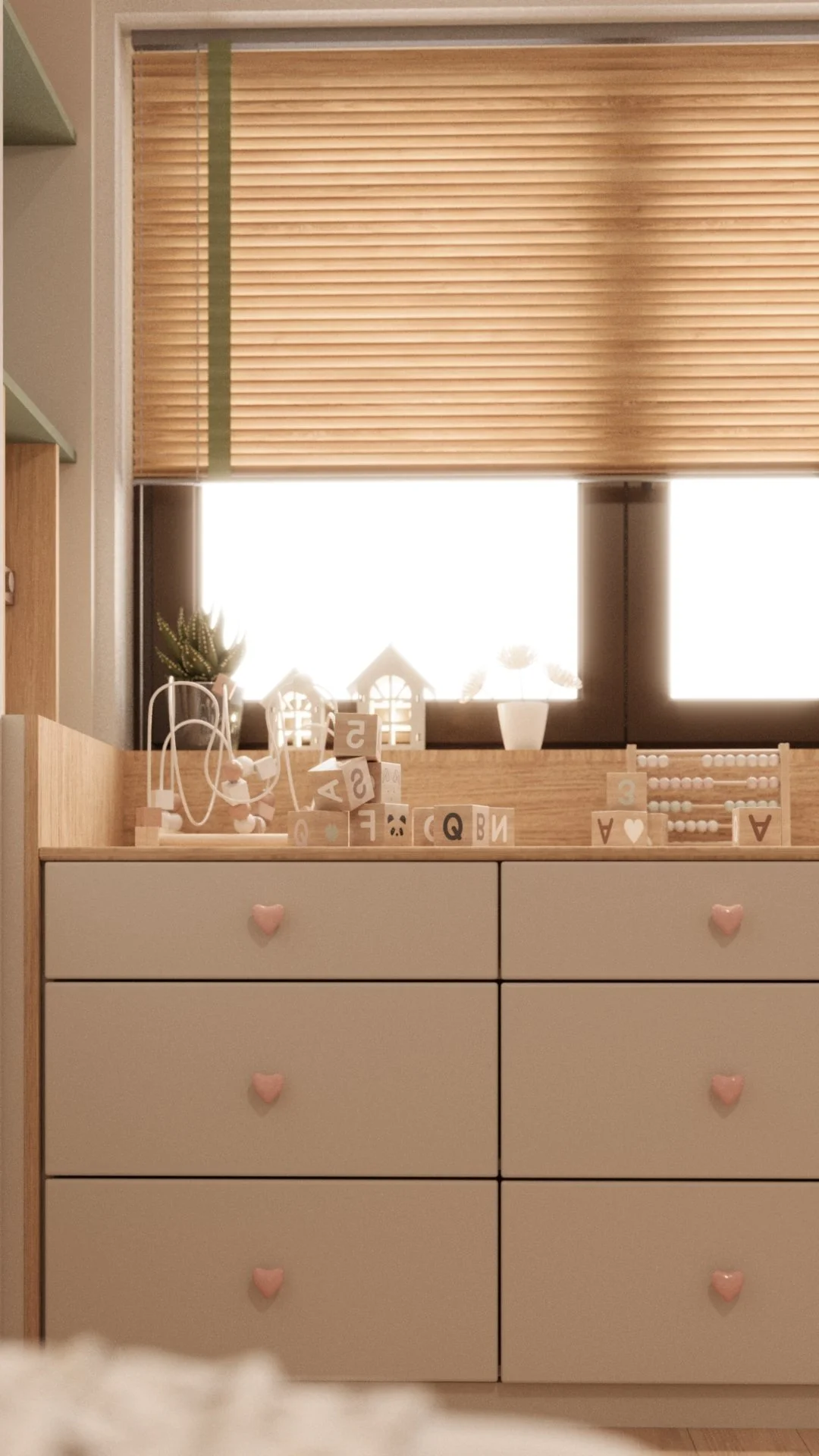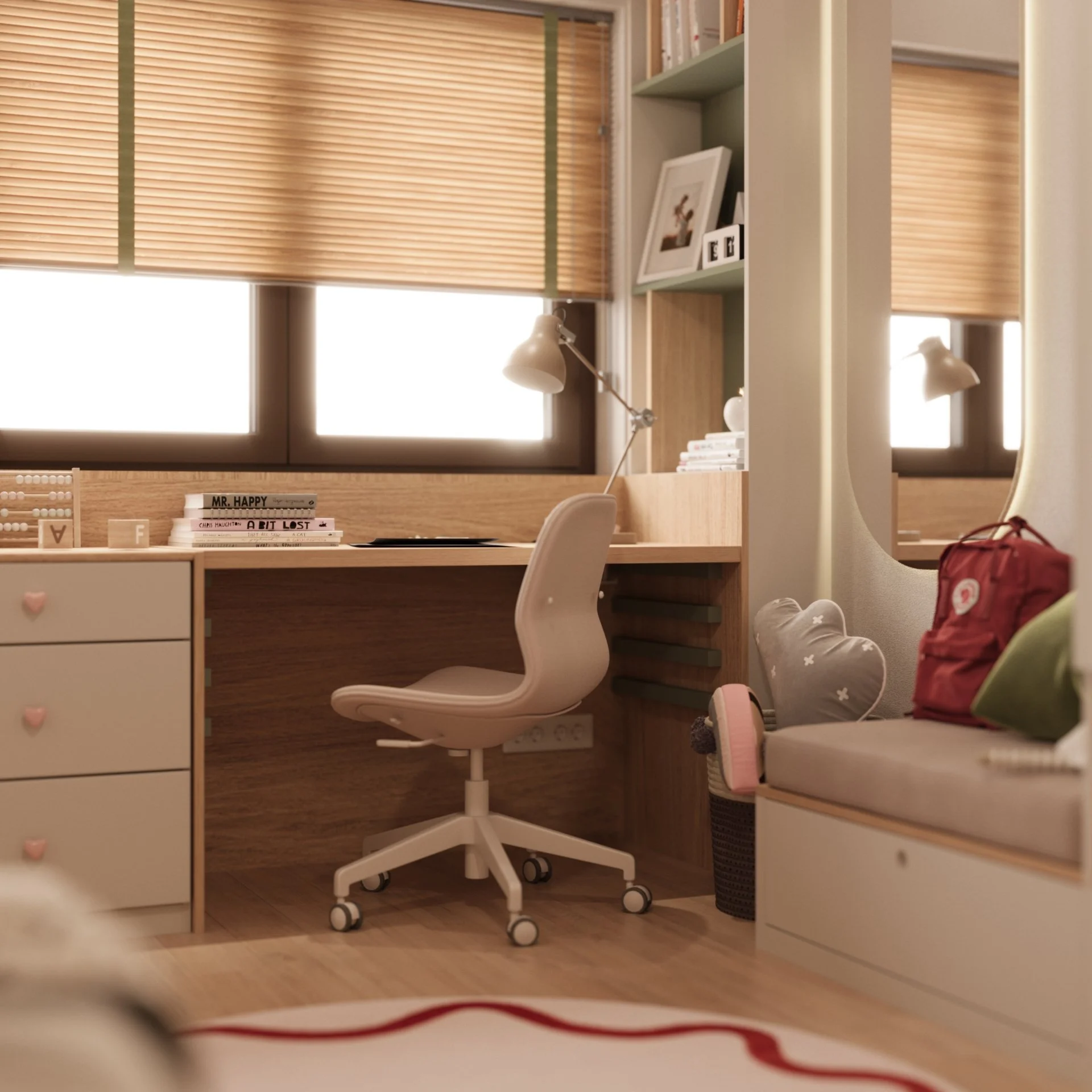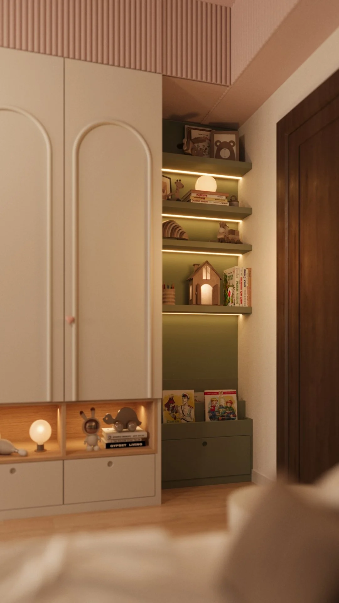 Acest dormitor a fost gândit ca un spațiu cald, echilibrat și adaptat ritmului unei fetițe de 6 ani. Zona de noapte este marcată de un pat tapițat cu forme simple, completată de o cromatică liniștitoare și caldă, unde verdele olive catifelat se întâlnește cu nuanțe pudrate de roz și accente naturale din lemn.